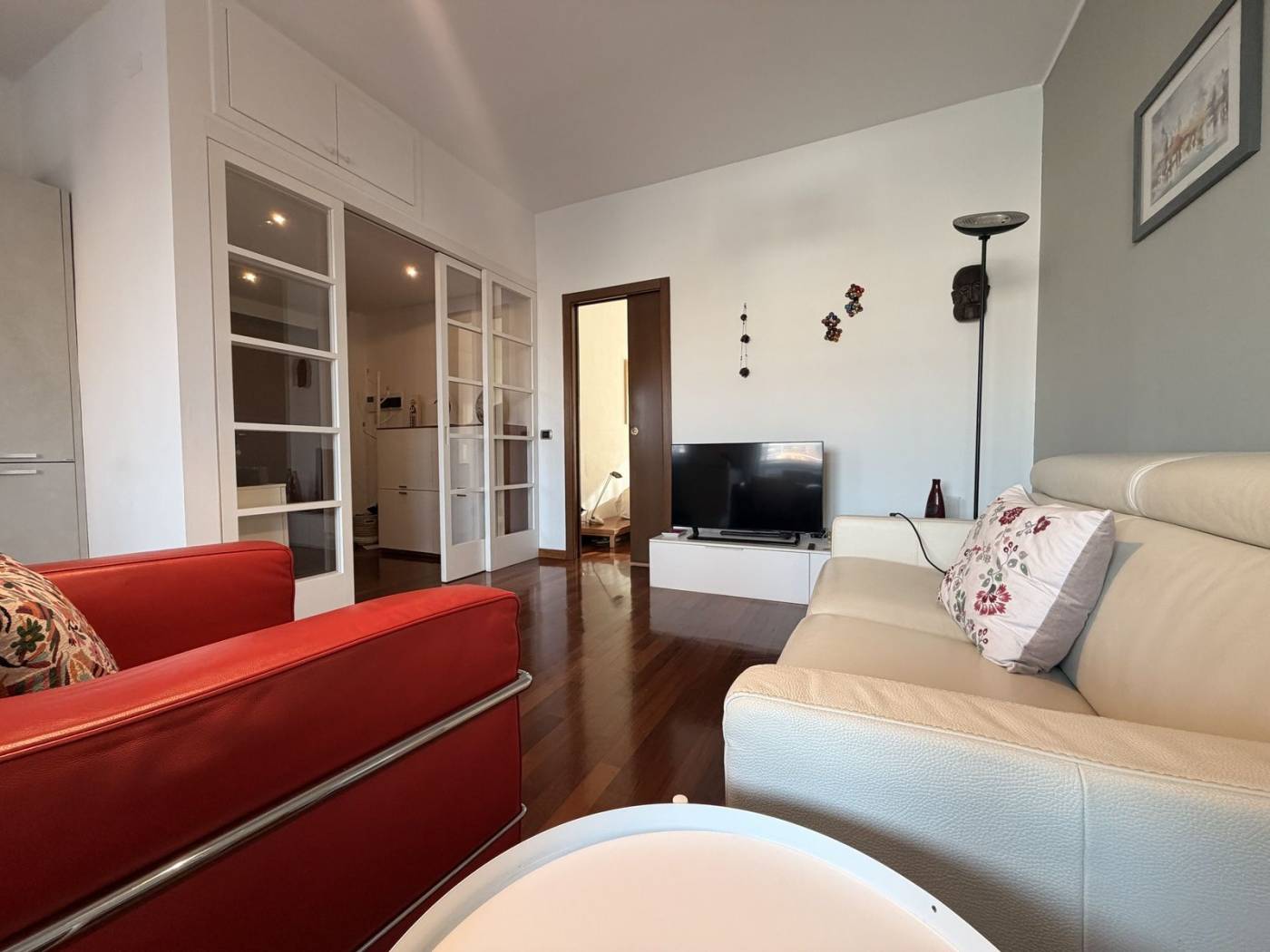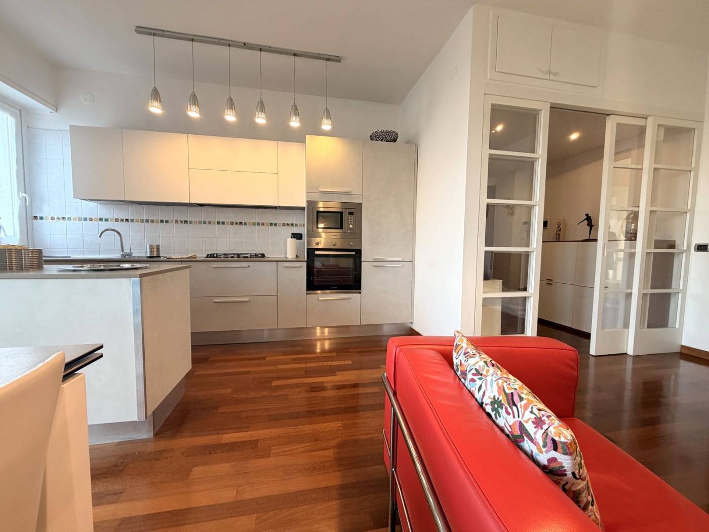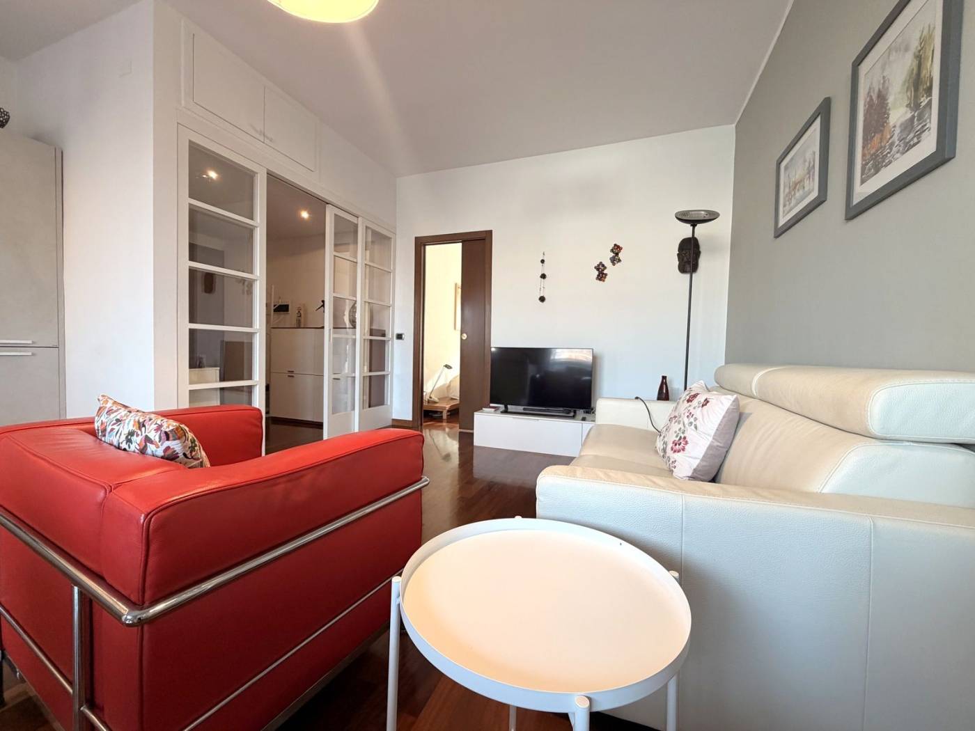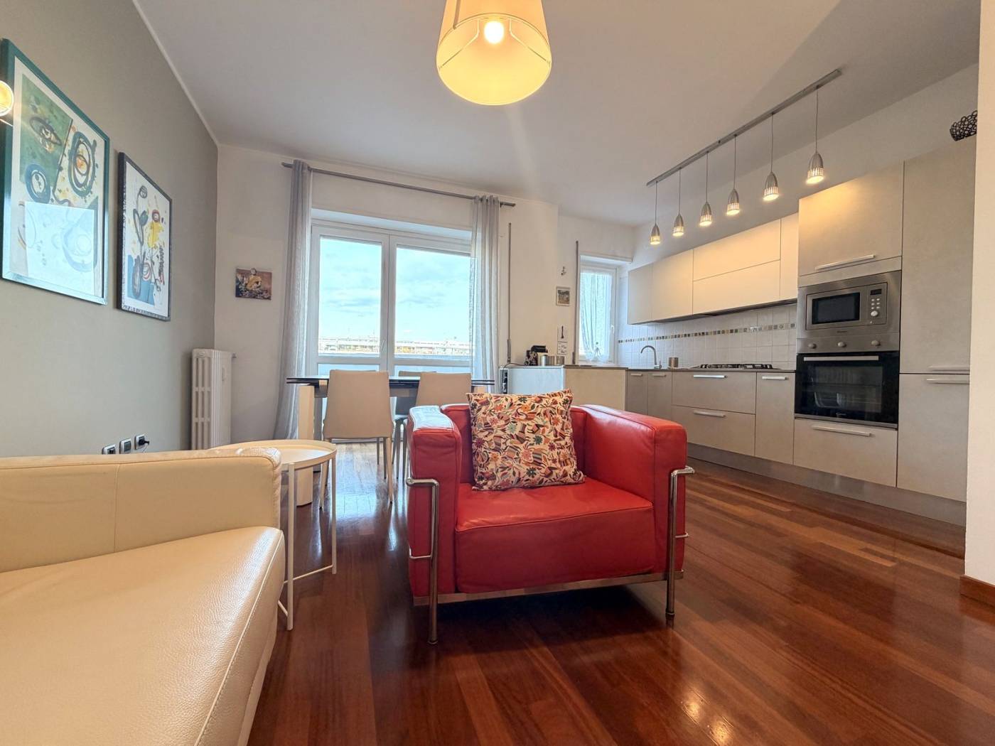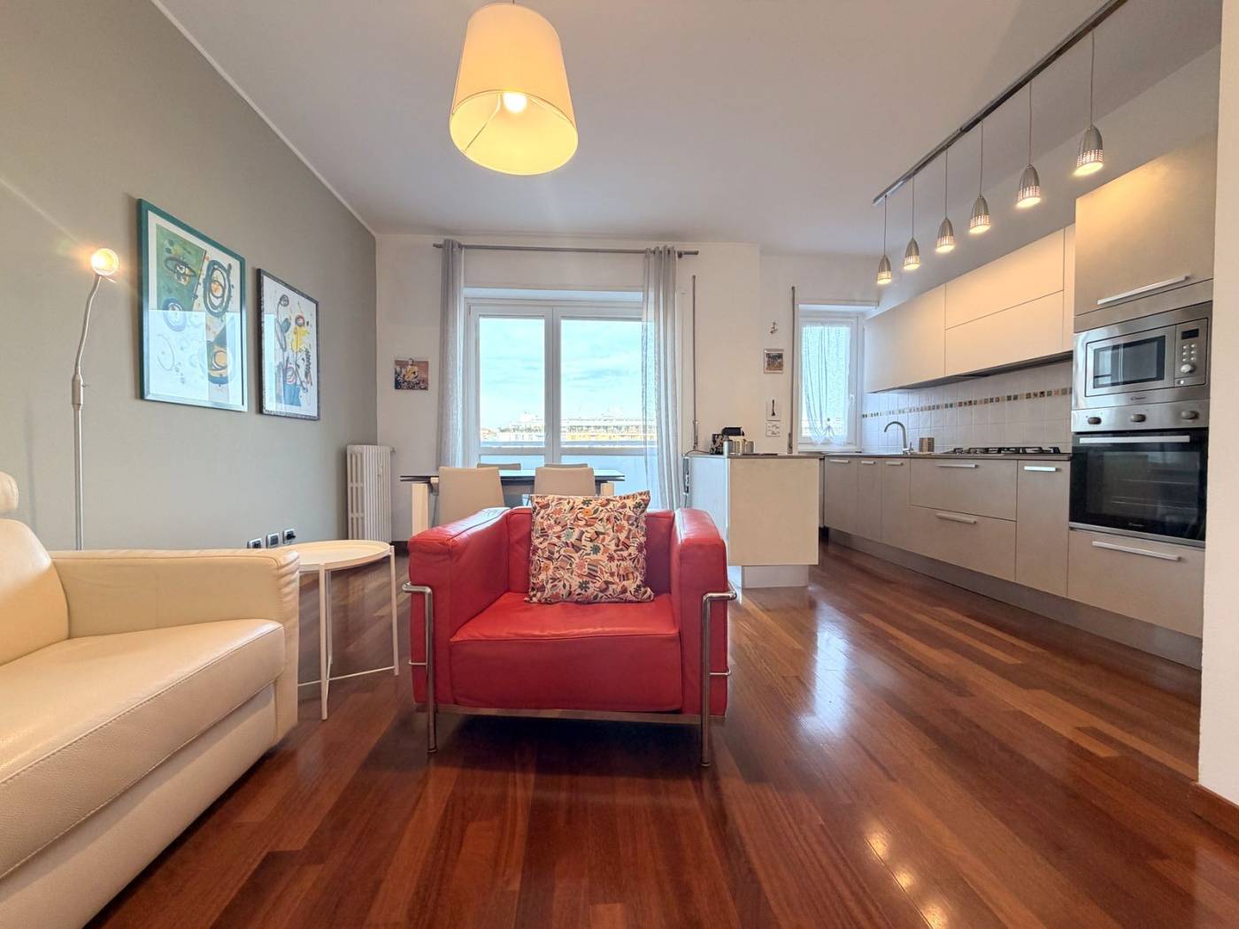 L'appartamento è composto da due locali ben distribuiti, con un ampio soggiorno che si affaccia su un balcone, ideale per godersi momenti di relax all'aria aperta. La cucina a vista è perfetta per chi ama cucinare e intrattenere. La camera matrimoniale, anch'essa dotata di un balcone, offre un angolo tranquillo per il riposo. Il bagno è spazioso e finestrato, completo di doppio lavello e doccia doppia, un vero lusso per la quotidianità.